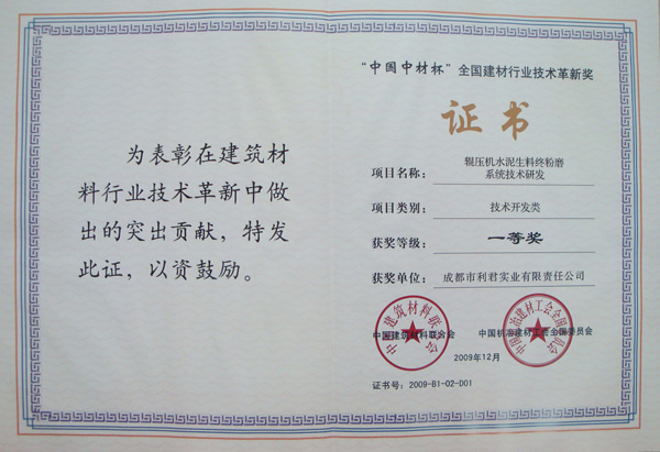 由“中國建筑材料聯(lián)合會”和“中國機冶建材全國委員會”舉辦的“中國中材杯”全國建材行業(yè)技術(shù)革新獎評比中,我公司“輥壓機水泥生料終粉磨系統(tǒng)技術(shù)研發(fā)項目”榮獲一等獎。12月19日公司派代表前往人民大會堂參加頒獎儀式。